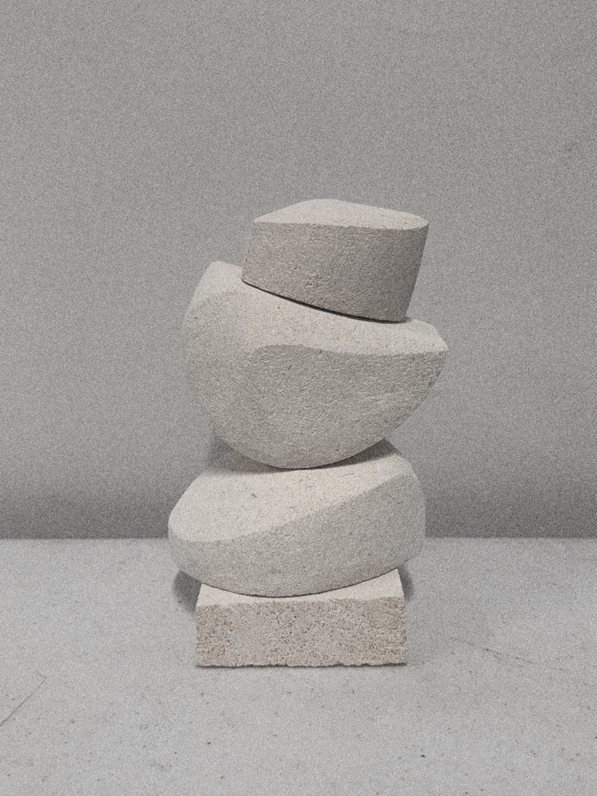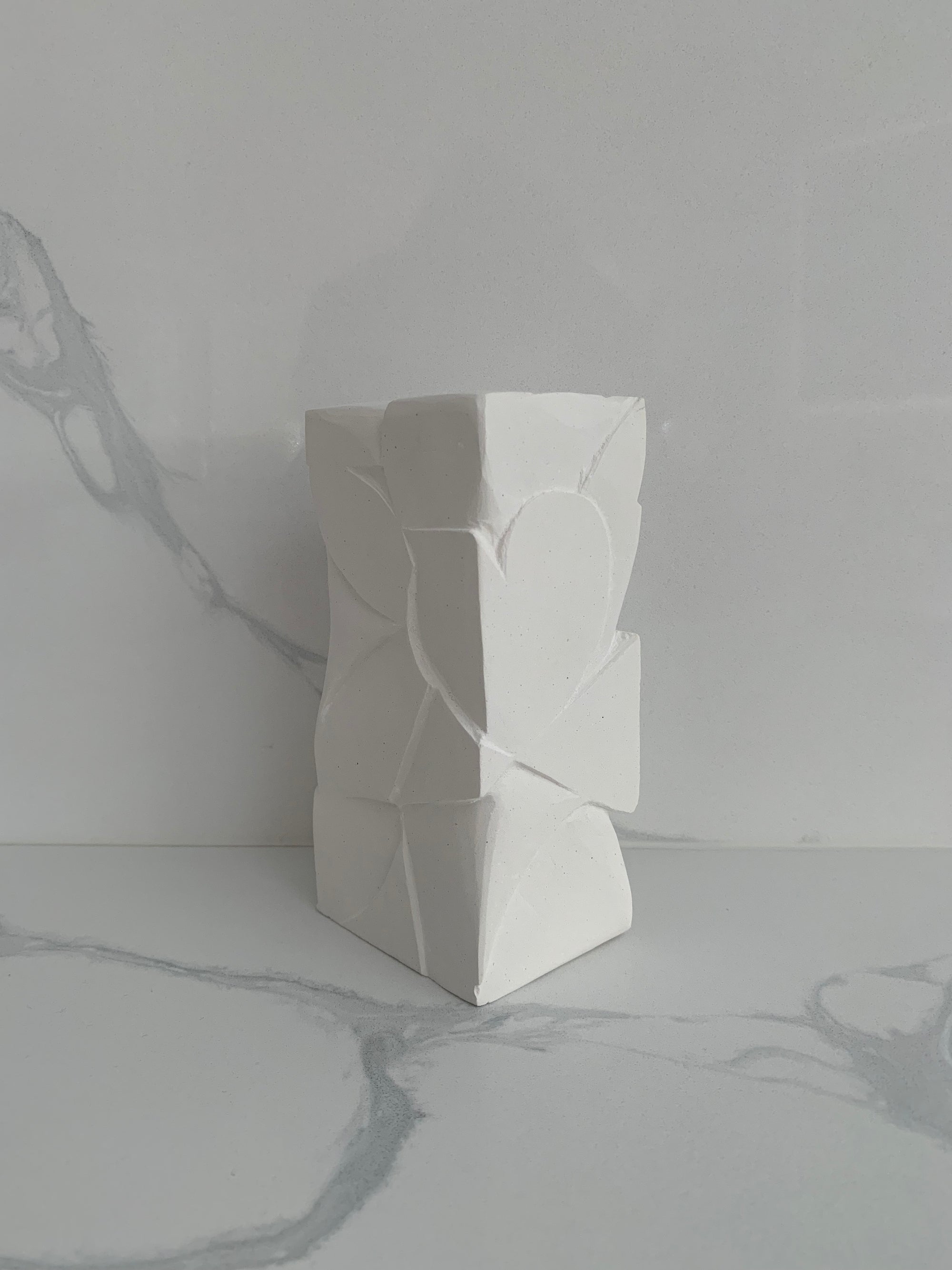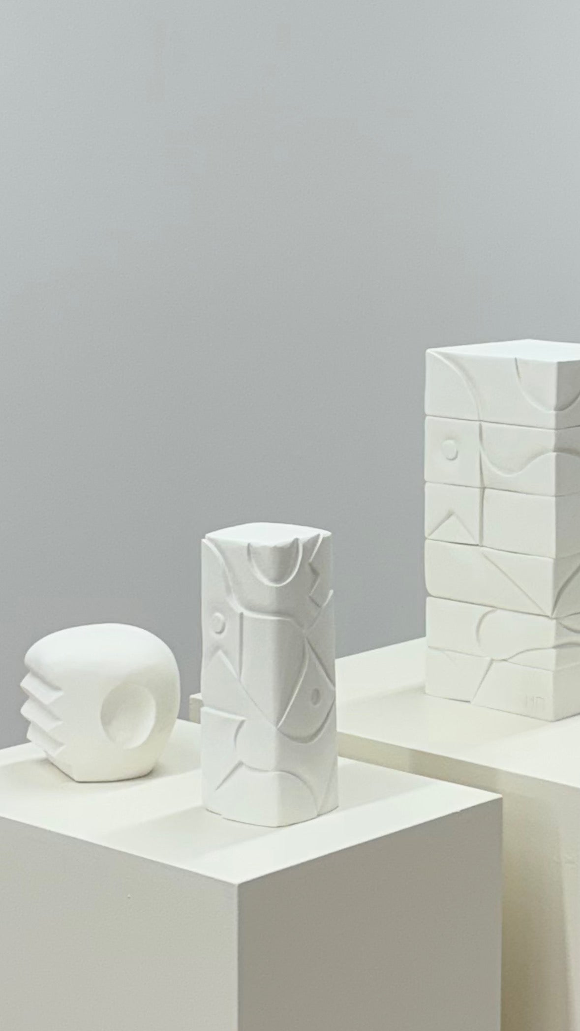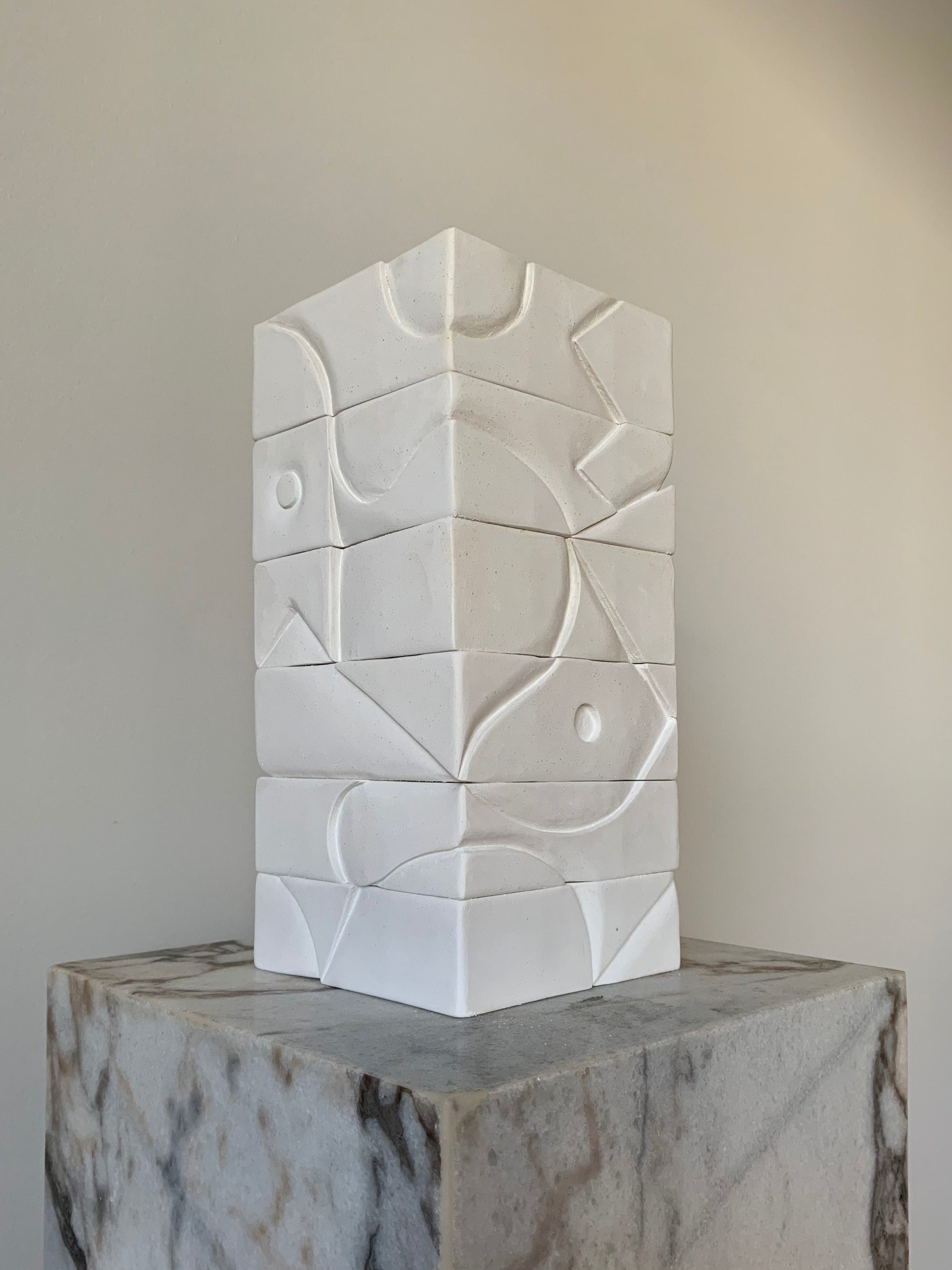 Marie Petridis explores form, balance, and repetition through minimalist, geometric sculptures. Working primarily with plaster of Paris, Marie Petridis' marble-like sculptural forms are reminiscent of Ancient Greek art and a connection to her heritage.