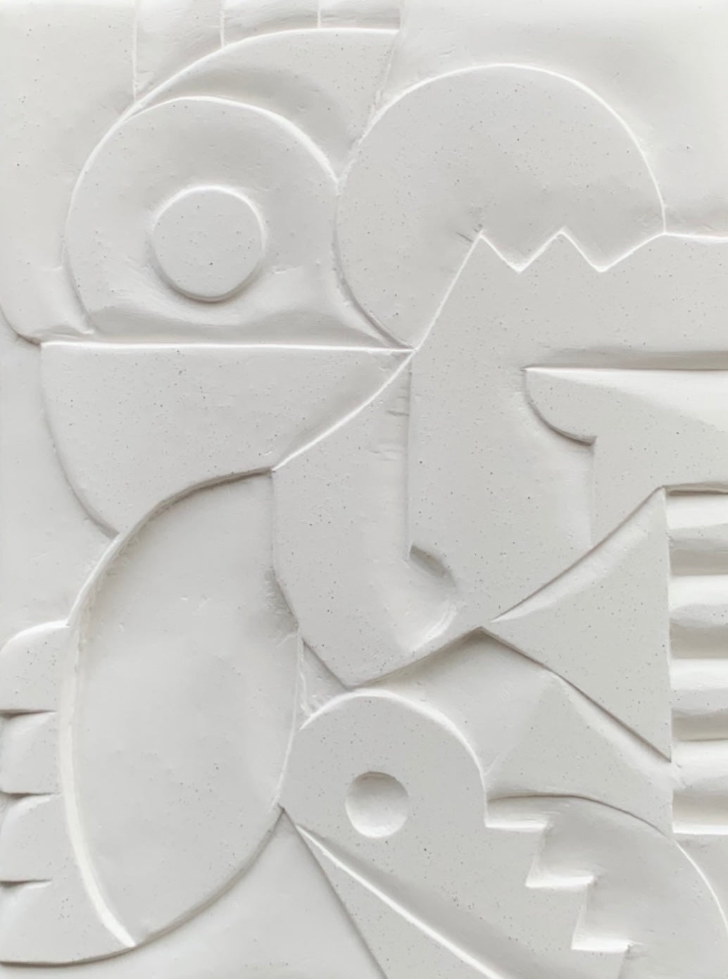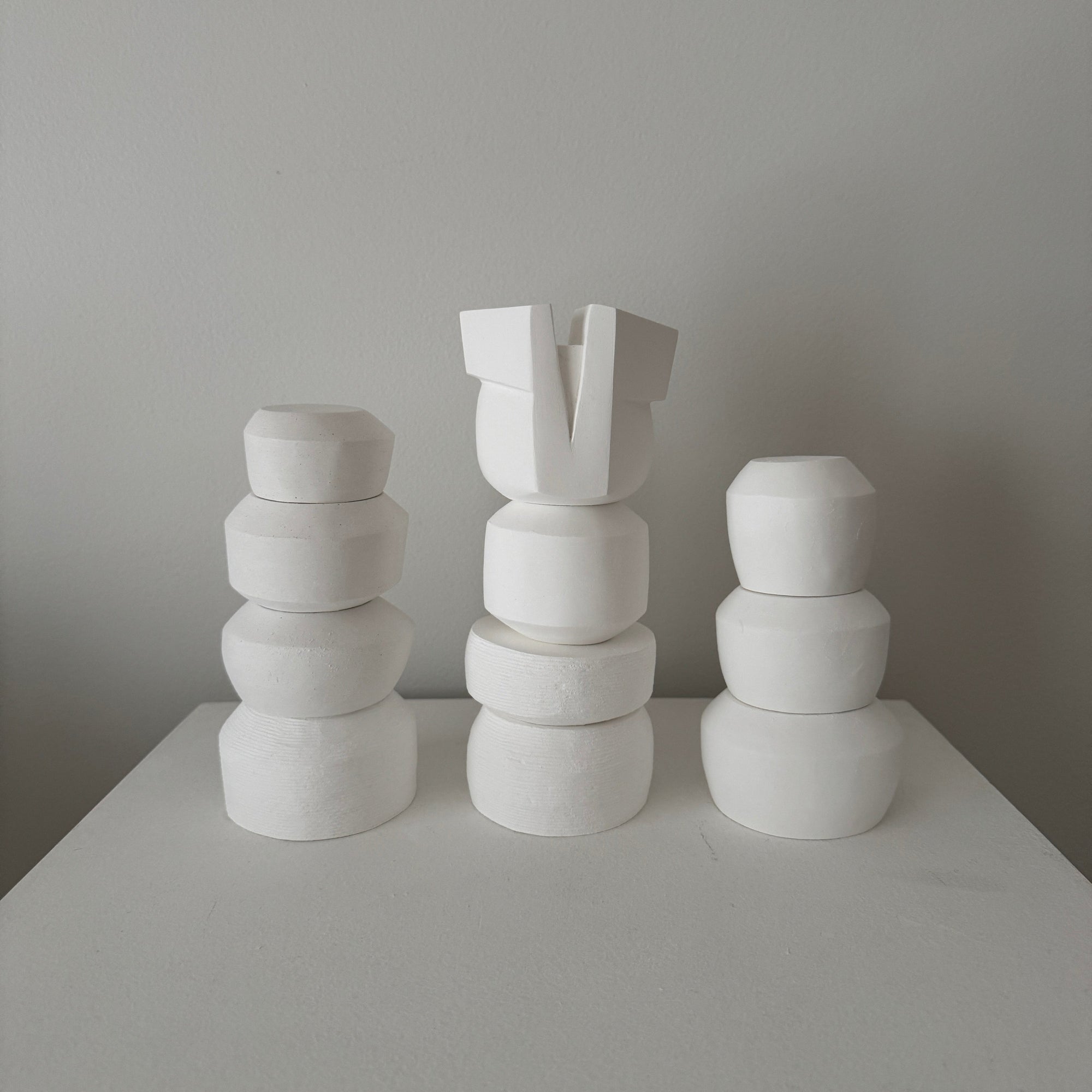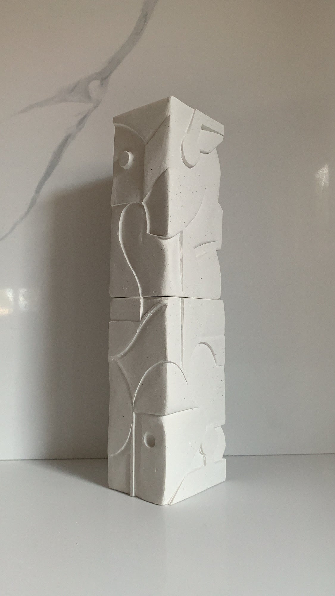 Marie Petridis explores form, balance, and repetition through minimalist, geometric sculptures. Working primarily with plaster of Paris, Marie Petridis' marble-like sculptural forms are reminiscent of Ancient Greek art and a connection to her heritage.